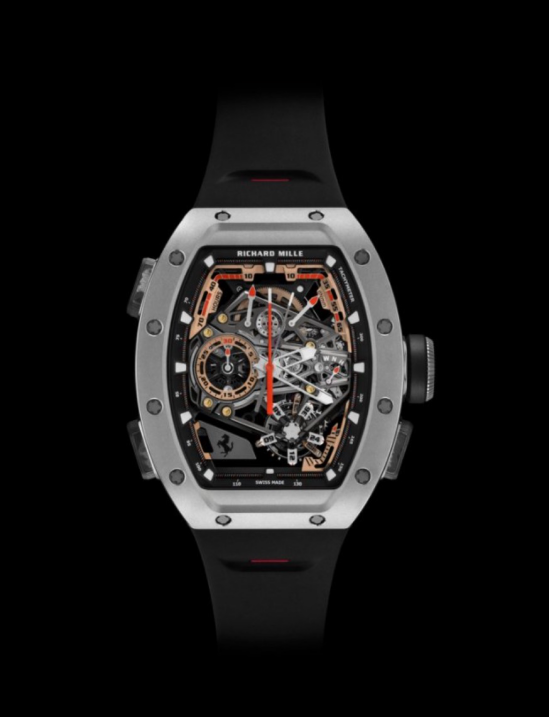 表盘反面的发条盒宝石镶嵌设想灵感源自Ferrari V8引擎的离合器轮,而488 ChallengeEvo、Daytona SP3和SF90 Stradale等车型充满力量感且棱角分明的外部细节,则影响了表壳制型、按钮和时标的设想。正如现代Ferrari 仪表盘的焦点元素—转速表,正在RM 43-01 上,30 分钟计时盘的镂空设想成为表盘核心,也成为手表“底盘”三维结构设想中惹人瞩目的环节。