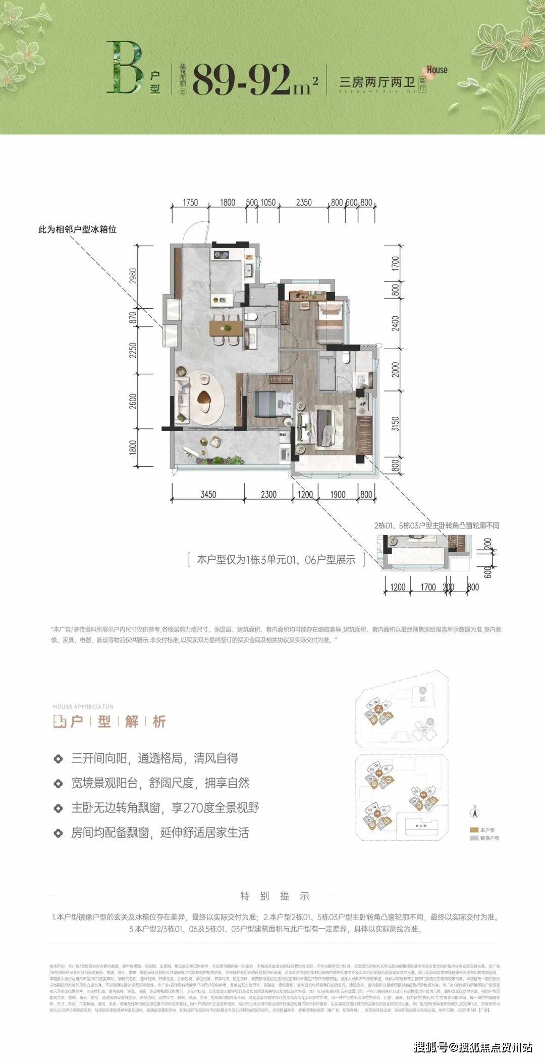 89-92㎡的3房2厅2卫,B户型,设想的是竖厅款式,客堂3。45米开间,LDKB一体化,S墙设想预留冰箱卡槽位,三开间朝南,动静分区,从卧270转角飘窗,3个卧室别离做到了从卧18。1㎡/次卧9。44㎡/次卧5。98㎡(包含墙体飘窗),客堂毗连次卧出5。75米长的大阳台,U型厨房,公卫三段式分手,得房率约93-99%(包含赠送),西南或东南朝向。