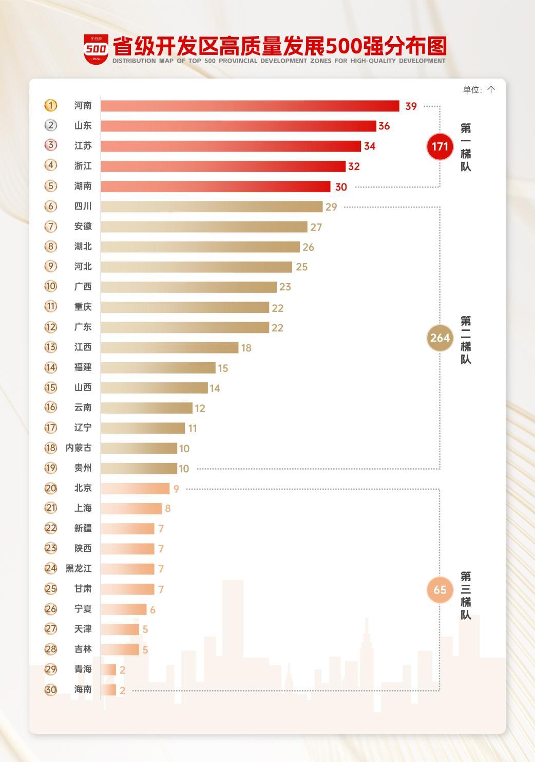 中国网财经3月26日讯 省级开辟区是处所经济成长的主要引擎,是鞭策区域经济高质量成长、加强处所分析实力的主要载体。跟着我国经济的快速成长,省级开辟区的数量不竭增加,截至2024年,我国省级开辟区总数量2200余个,地级行政区笼盖率跨越90%,多年来,省级开辟区对推进处所体系体例、改善投资、指导财产集聚、成长型经济等方面阐扬了主要的感化。当前,较多省级开辟区面对办理体系体例不顺、同质合作严沉、立异能力不脚、财产能级不高档问题,正处于整合优化、提质增效的环节期。为帮推省级开辟区高质量成长,赛迪参谋对省级开辟区进行了系统研究阐发,通过对分析成长实力、科技立异能力、区域成长活力、计谋支持力、高效组织力等五个方面的研究,为省级开辟区高质量成长供给洞察取参考。注:开辟区名称来历于《中国开辟区审核通知布告目次(2018版)》、各处所网坐、各开辟区管委会官网,或取存案名称存正在差别。数据来历:赛迪参谋,2024。12从2024《省级开辟区高质量成长500强》的区域分布看,河南、山东、江苏、浙江、湖南位于前五,入榜开辟区数量达到30个及以上,入榜开辟区总数量共171个,是入榜数量头部梯队;四川、安徽、湖北等地入榜开辟区总数量共264个;、上海、新疆等地入榜开辟区总数量共65个。